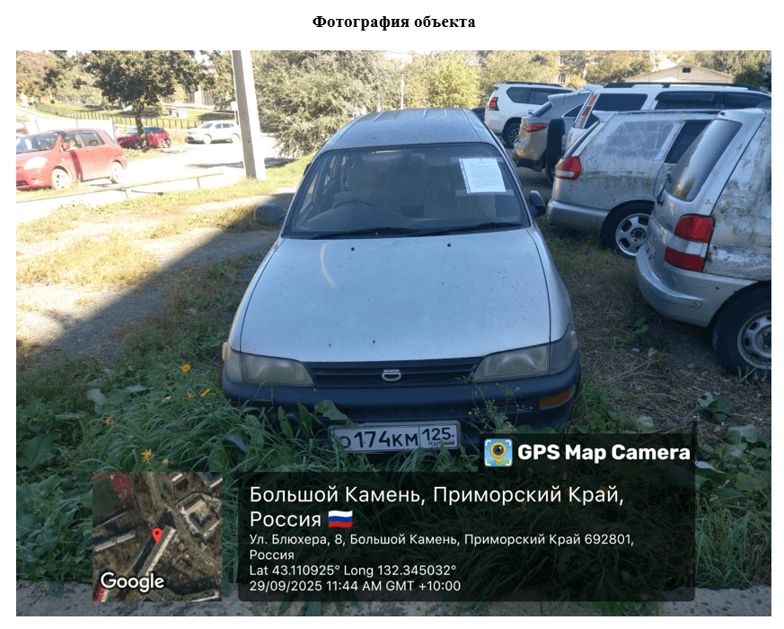 По результату осмотра установлено, что на данной территории расположен объект движимого имущества – брошенный автомобиль (порядковый номер на схеме № 1).