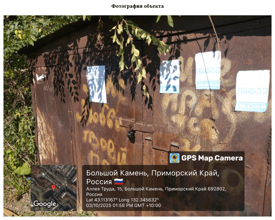 В соответствии с Земельным кодексом Российской Федерации, Федеральным законом от 06.10.2003 № 131-ФЗ «Об общих принципах организации местного самоуправления в Российской Федерации», постановлением администрации городского округа Большой Камень от 13.08.2025 № 2261 «Об утверждении Порядка освобождения самовольно занятых земельных участков, находящихся в муниципальной собственности городского округа Большой Камень, земельных участков, государственная собственность на которые не разграничена, и переноса иных объектов движимого имущества на территории городского округа Большой Камен»., предлагаем добровольно, в срок до «31» октября 2025 года: