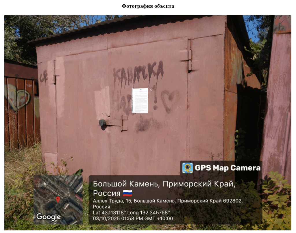 В соответствии с Земельным кодексом Российской Федерации, Федеральным законом от 06.10.2003 № 131-ФЗ «Об общих принципах организации местного самоуправления в Российской Федерации», постановлением администрации городского округа Большой Камень от 13.08.2025 № 2261 «Об утверждении Порядка освобождения самовольно занятых земельных участков, находящихся в муниципальной собственности городского округа Большой Камень, земельных участков, государственная собственность на которые не разграничена, и переноса иных объектов движимого имущества на территории городского округа Большой Камен»., предлагаем добровольно, в срок до «31» октября 2025 года:
