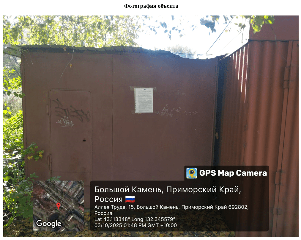 В соответствии с Земельным кодексом Российской Федерации, Федеральным законом от 06.10.2003 № 131-ФЗ «Об общих принципах организации местного самоуправления в Российской Федерации», постановлением администрации городского округа Большой Камень от 13.08.2025 № 2261 «Об утверждении Порядка освобождения самовольно занятых земельных участков, находящихся в муниципальной собственности городского округа Большой Камень, земельных участков, государственная собственность на которые не разграничена, и переноса иных объектов движимого имущества на территории городского округа Большой Камен»., предлагаем добровольно, в срок до «31» октября 2025 года: