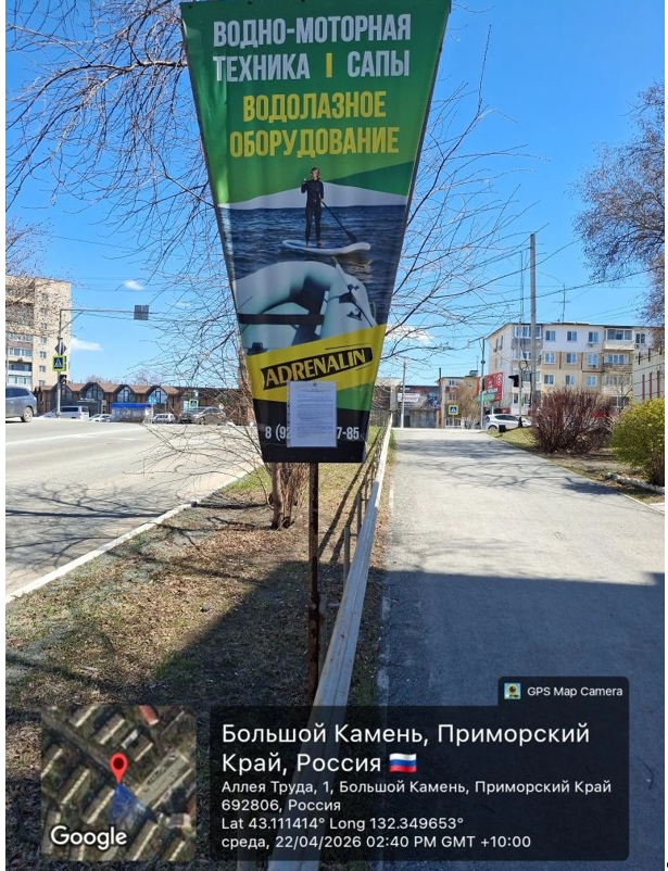 Должностным лицом управления архитектуры и градостроительства администрации городского округа Большой Камень выявлен факт установки и эксплуатации рекламной конструкции без предусмотренного законодательством разрешения на ее установку и эксплуатацию.